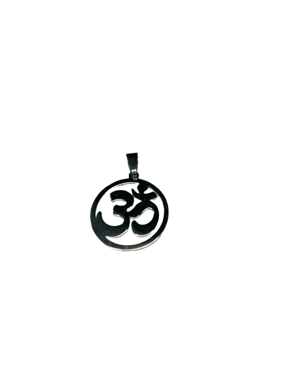 Amuleto con símbolo OM en acero que representa paz, equilibrio y conexión espiritual profunda.