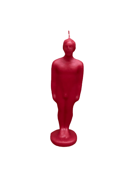 La figura de cera hombre rojo representa energía, vigor y fortaleza espiritual. Una pieza devocional que inspira protección y poder.  Ideal para rituales de amor.