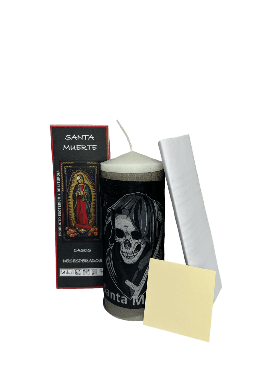 El velón preparado Santa Muerte Negro trabaja protección extrema, corte de enemigos y defensa ante injusticias. Su energía rompe maldiciones y sella tu campo espiritual.